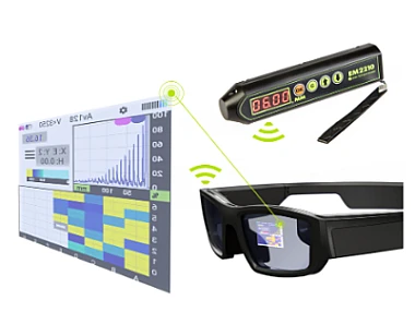 ЭМА толщиномер ЕМ2210 по Вашему желанию может быть дополнен носимыми смарт-очками. Носимые смарт-очки позволяют производить измерения ЭМА толщиномером ЕМ2210 в труднодоступных местах, где считывание показаний прибора с дисплея не представляется возможным или затруднено. Показания в этом случае отображаются на стекле смарт-очков и их всегда видно оператору.