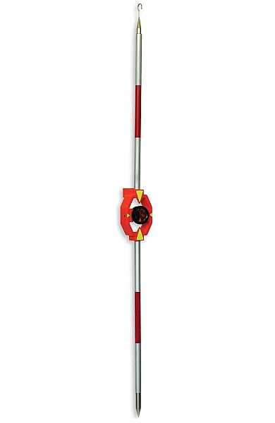 В комплекте поставляется разборная металлическая веха, которая позволяет изменять высоту размещения минипризмы вплоть до 1.3 м. В собранном состоянии конструкция из 4 резьбовых секций надежна и стабильна, элементы вехи качественно окрашены и не подвержены коррозии. Заостренный металлический наконечник обеспечивает надежную установку на рыхлых поверхностях, таких как грунт или песок. Также имеется специальный крючок, при помощи которого можно подвесить отражатель в необходимом положении.