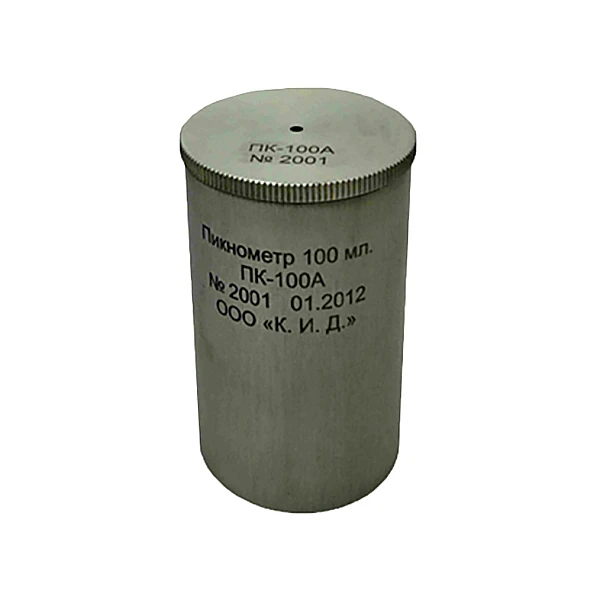Алюминиевый пикнометр емкостью 100 мл. представляет собой стакан с притертой крышкой, на которой имеется отверстие для выпуска излишков испытуемого материала. Пикнометр изготавливается из твердого алюминиевого сплава с низким коэффициентом температурного расширения.